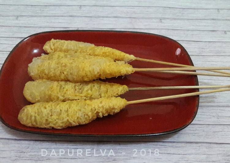 2. Tuangkan minyak goreng agak banyak, masukkan telur, lalu bihun rebus diatasnya, ambil tusuk sate, gulung dengan tusuk sate. Angkat, sisihkan.