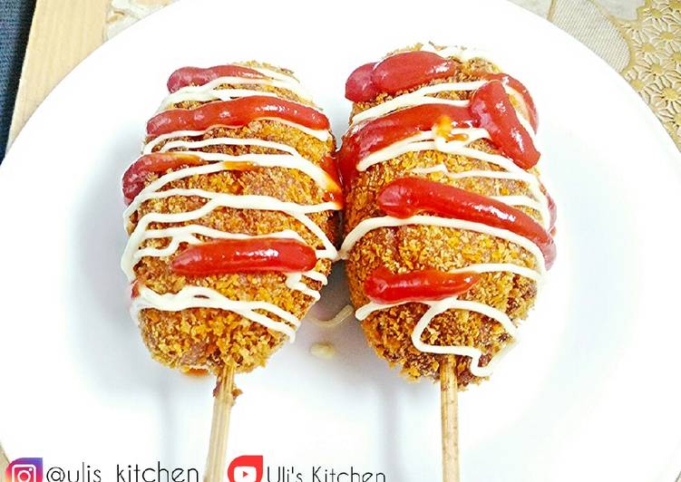- Panaskan minyak goreng.Goreng corndog hingga terendam.Masak hingga kuning keemasan.Angkat,bila suka bisa langsung dilumurin dengan gula.